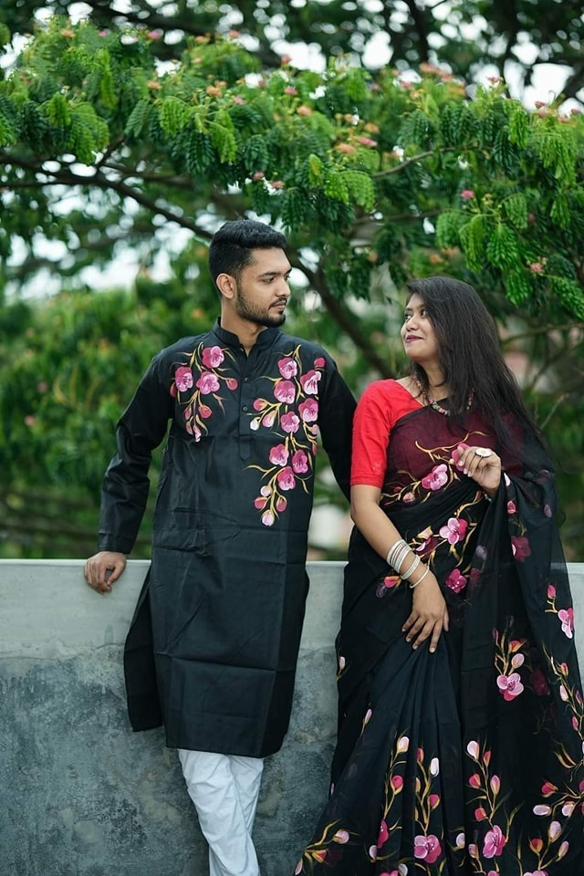 Half Silk Hand Print Saree & Panjabi Couple Dress – Elegant Traditional Wear